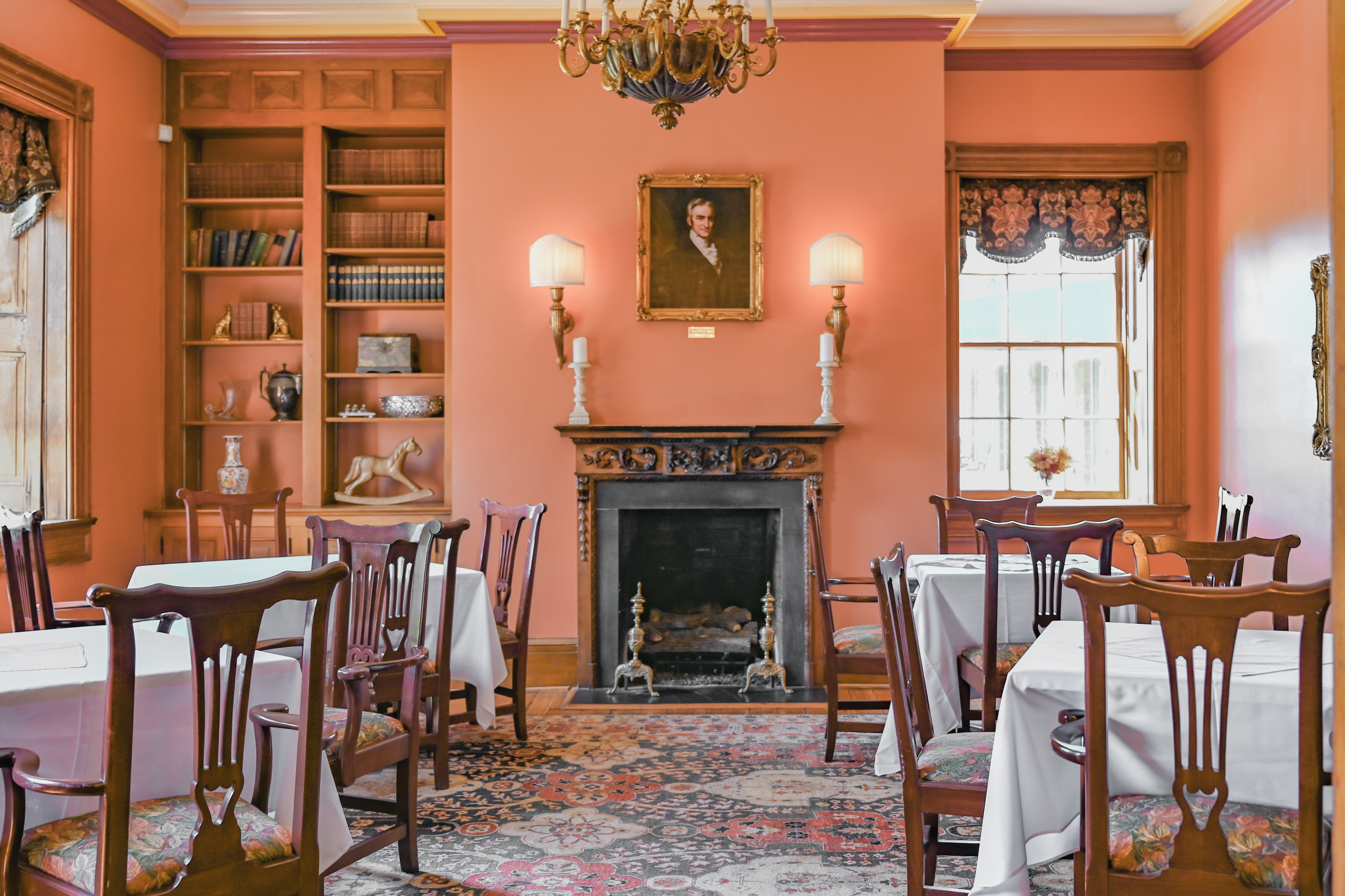 The Mansion provides quiet dining with a club casual dress code. From the elegant chandeliers to the original marble fireplace, the rooms exude warmth and ambience.